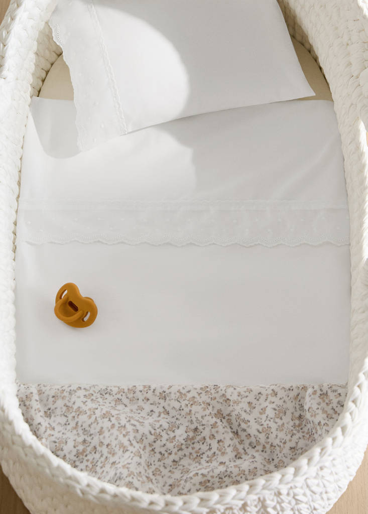 100% Cotton. Percale cotton fabric. 180 threads. Includes top sheet and mini-cot pillowcase. Size: 75x100cm + 20x30. Ruffle with embroidery. Fresh, soft, durable, breathable, versatile. A good wardrobe staple. Cool, soft, durable, breathable and versatile fabric. A good wardrobe staple