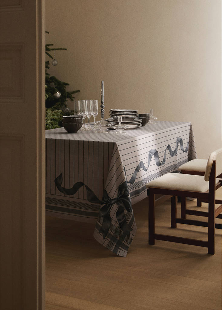 100% Cotton. Size: 150x250cm. This cotton tablecloth, crafted from 100% cotton and manufactured in Spain, stands out for its elegant design and high-quality craftsmanship. Its composition guarantees softness and durability. Its design with geometric lines and its combination with the bow gives it a sophisticated and festive air, ideal for both celebrations and more formal occasions