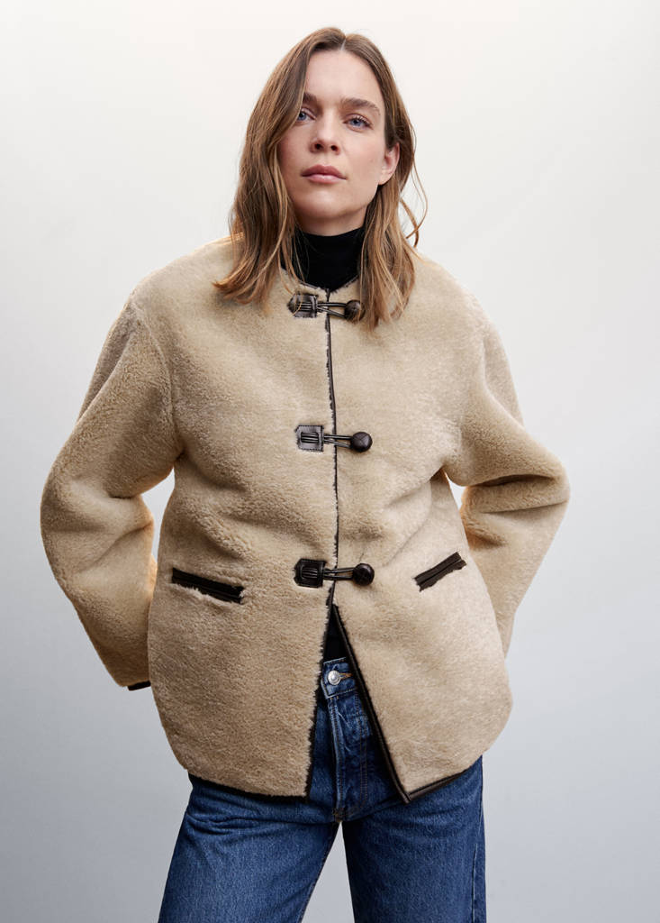 Faux fur fabric. Straight design. Oversize design. Rounded neck. Long sleeve. Toggle button fastening. Two front pockets. Inner lining. Contrasting trims