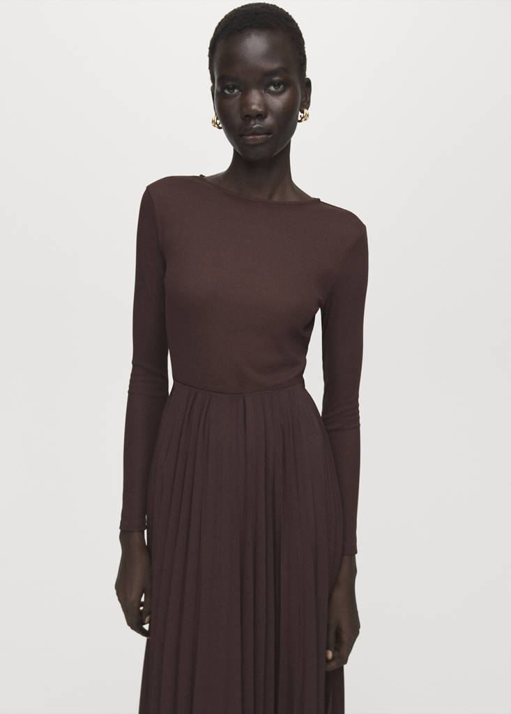 Combined design. Midi design. A-line design. Pleated skirt. Crew neck. Long sleeves. Belt loops. Belt with metal fastening. No Fastening. Online Exclusive