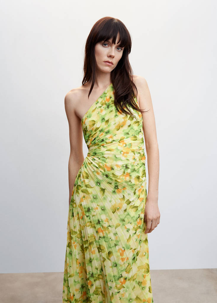 Midi design. Flowy fabric. Light fabric. Asymmetrical. Side closure. Lining only. Sleeveless. Pleated fabric. Straight design. Asymmetric design. Midi fit. Floral print. Wide strap. Side slit. Side zip fastening. Inner lining. Asymmetric hem. The blue dress does not have the side slit detail. Plus Size Available. Party and events collection