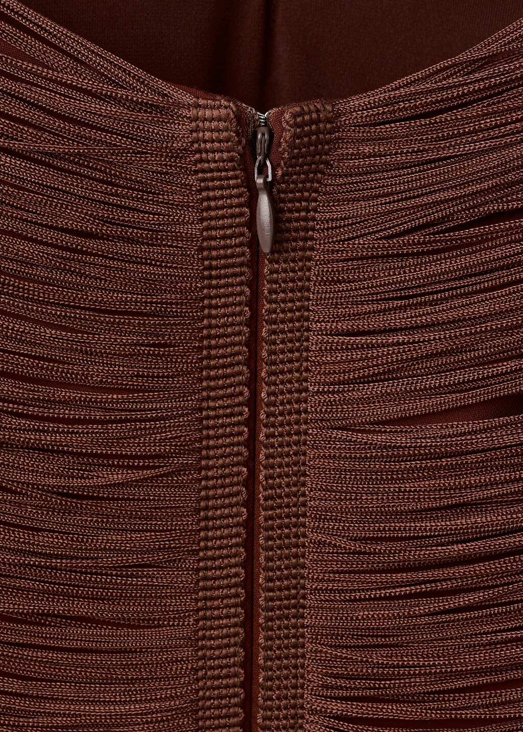 This dress embodies modern elegance with its carefully designed fringes that create a fluid and sophisticated movement. The thin crossed straps at the back offer an elegant design that enhances the structure of the dress, while the deep back neckline adds a touch of refined sensuality.. Fringe design. Fitted design. Midi design. Draped neckline. Sleeveless. Crossover straps on the back. V-neckline in the back. Zip fastening on the back section. Inner lining. This garment is part of our party and event collection, designed to elevate your looks for special occasions. Items from the CAPSULE collection can be exchanged or returned within 14 days from the date of shipment.