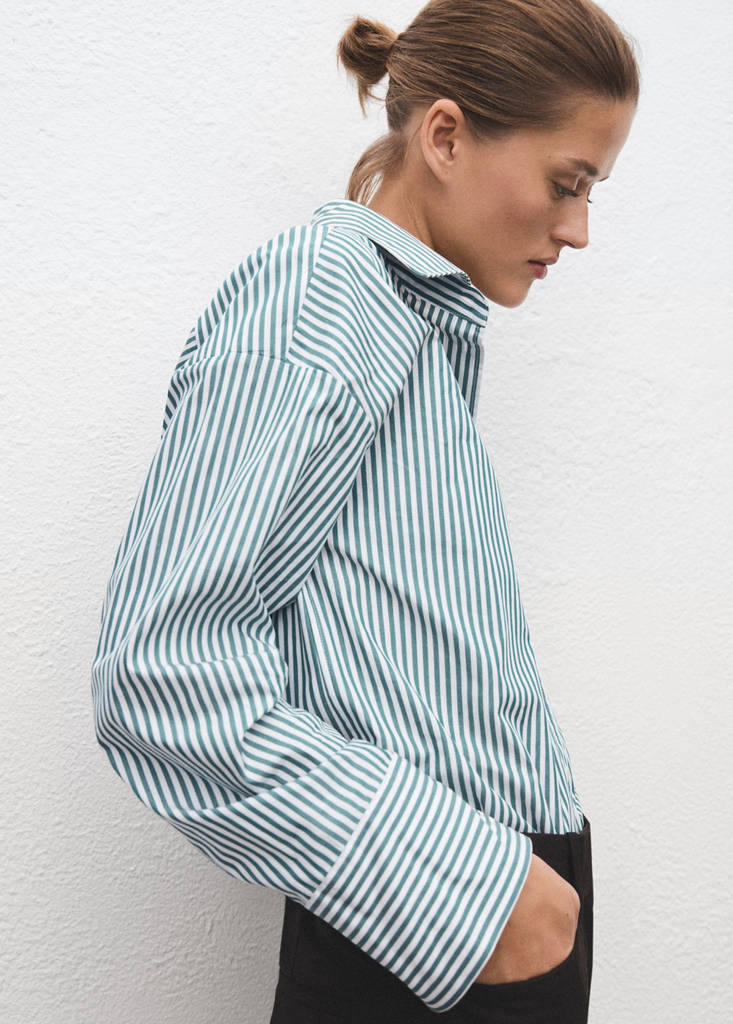 Crafted from cotton poplin fabric, this garment features an oversized design with stripes. It includes a shirt collar and long sleeves with buttoned cuffs. The front closure is with buttons