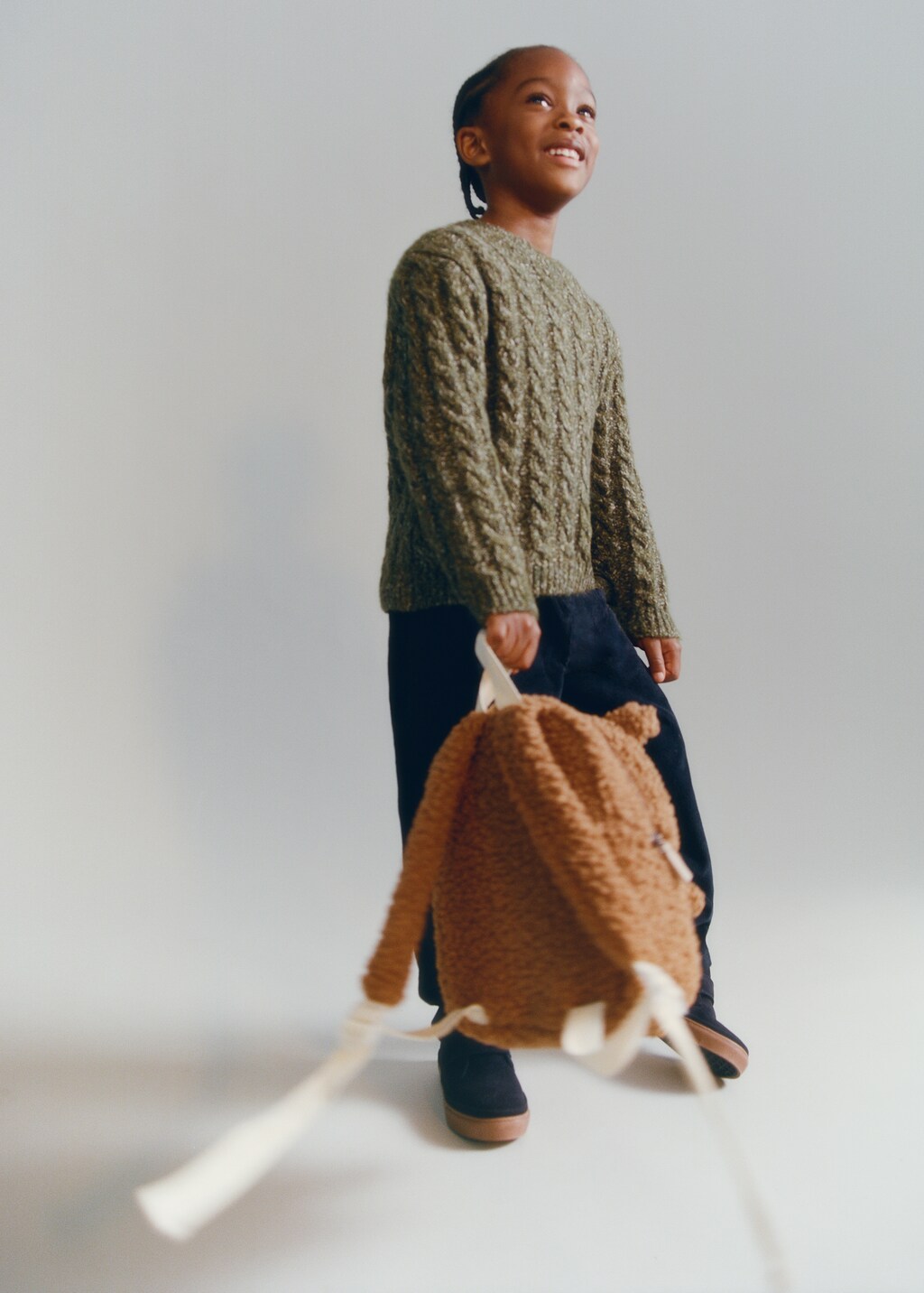 Mješavina pamuka i vune. Ravni dizajn. Ispleteni dizajn. Okrugli izrez. Dugi rukav. Rebrasta završna obrada. Kopčanje gumbom na stražnjoj strani.