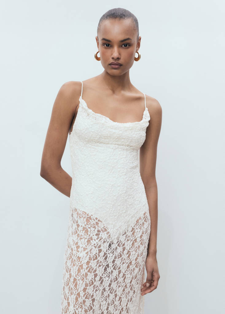 Čipkasta tkanina. Poluprozirni dizajn. Dugi dizajn. Uzak kroj. Asimetričan rub. Drapirani ovratnik. Tanke naramenice. Odjeća za oblikovanje tijela. Bez zatvarača