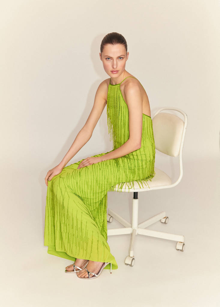 Nabavite jedinstveni odjevni predmet koji će vas učiniti idealnim gostom. Njegov dizajn s ovratnikom oko vrata i mnoštvom resa ukrašenih kamenčićima te otvorenim leđima laskat će vam na bilo kojem događaju. Fluidna tkanina. Ravni dizajn. Dugi dizajn. Resasti dizajn. Halter ovratnik. Bez rukava. Bez zatvarača. Unutarnja podstava. Ručni rad. Kolekcija za zabave, ceremonije i pričesti. Artikle iz kolekcije CAPSULE možete zamijeniti ili vratiti unutar 14 dana od datuma isporuke
