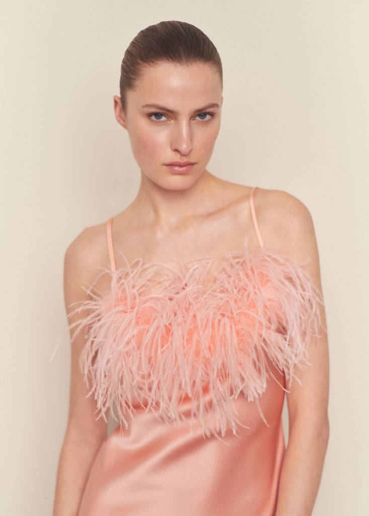 Elegantan, sofisticiran i laskav: ovaj satenski odjevni predmet u stilu negližea bez naramenica ukrašen perjem idealna je opcija za sezonska događanja. Saten tkanina. Dugi dizajn. Pravokutni izrez. Bez rukava. Podesive tanke naramenice. Bez zatvarača. Detalj perja. Kolekcija za zabave, ceremonije i pričesti. Artikle iz kolekcije CAPSULE možete zamijeniti ili vratiti unutar 14 dana od datuma isporuke. Uzak kroj