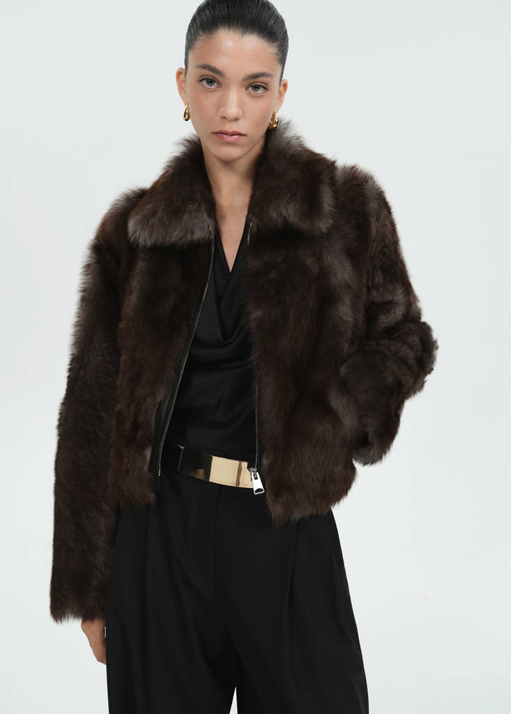 100% ovčja koža. Krzno. Teška struktura. Dvostrani dizajn. Ravni dizajn. Kratki dizajn. Košulja ovratnik. Dugi rukavi. Kopčanje patentnim zatvaračem na prednjem dijelu. Dva bočna džepa. Kolekcija za zabave, ceremonije i pričesti. Kolekcija Selection