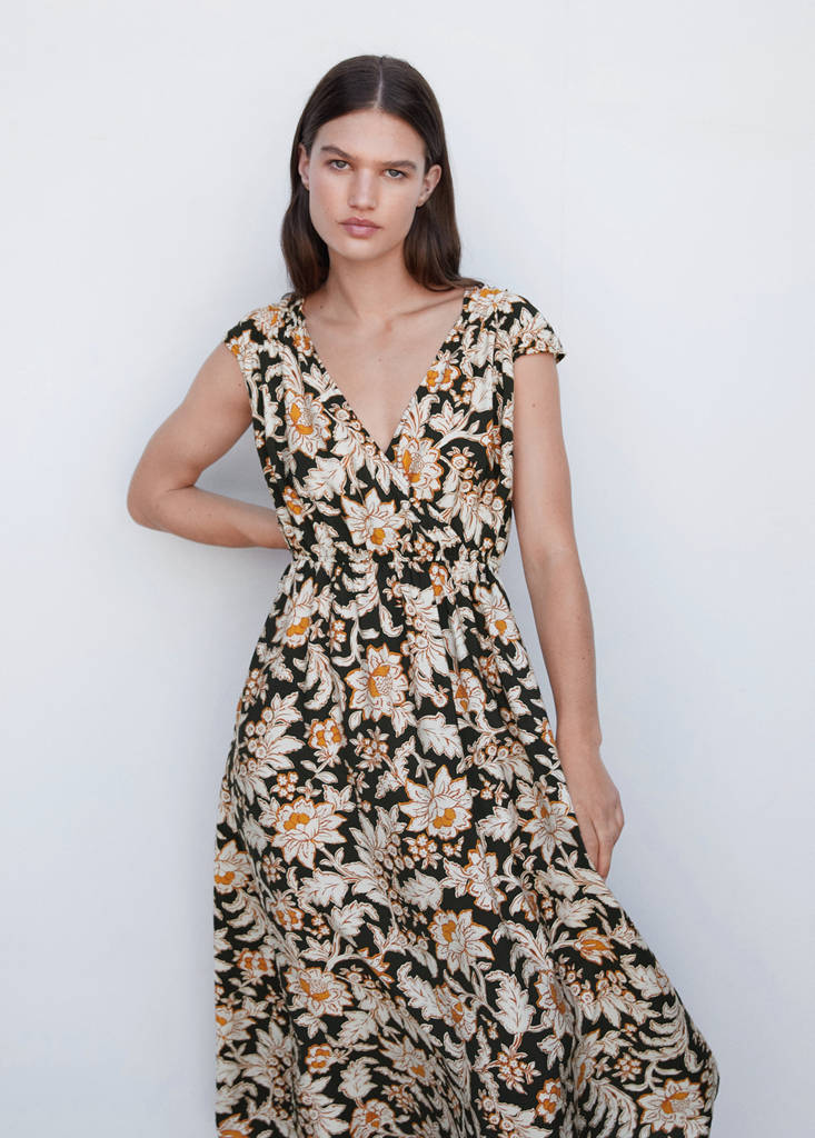 Tissu fluide, croisé, motif floral, coupe longue, col en V, manches courtes, décolleté en V dans le dos, lien à nouer au dos, taille élastiquée.