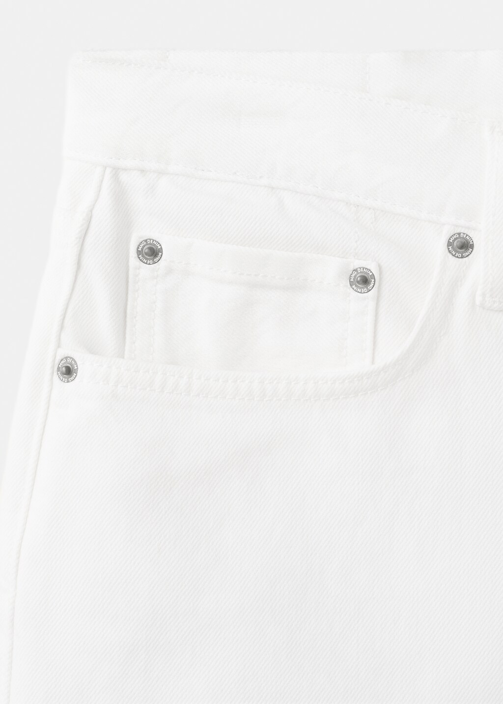 Coupe droite. Tissu en coton de style jean. Passants pour ceinture. Fermeture éclair et bouton. Deux poches latérales. Poche gousset. Deux poches plaquées à l'arrière
