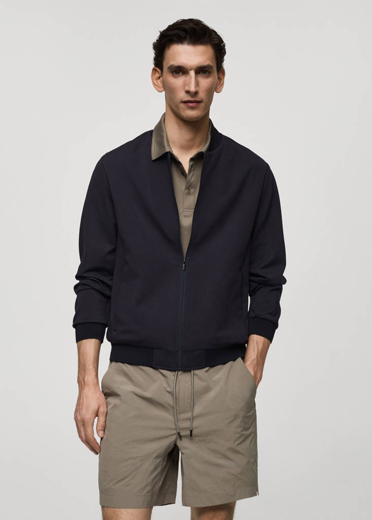Collection Performance. Entretien facile : la finition du tissu facilite l'entretien et le repassage du vêtement. Stretch : tissu élastique. Il offre un confort supplémentaire au quotidien. Tissu avec protection UV. Style bomber. Col bomber en maille côtelée. Fermeture Éclair à l’avant. Deux poches avant à fermeture Éclair invisible. Bas élastique. Hydrofuge : La finition résistante de ce vêtement protège contre les pluies légères, repoussant le contact avec l'eau et les gouttes de pluie. Bords côtelés au niveau du col, des manches et sur le bas