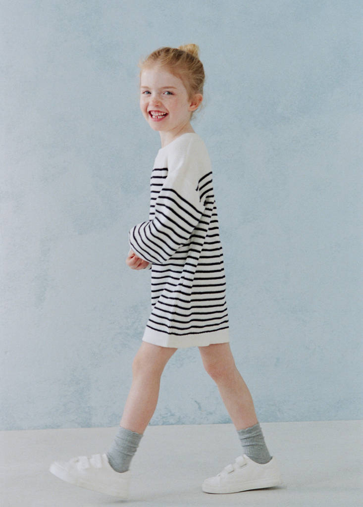 100% cotton fabric. Knitted fabric. Striped fabric. Midi design. Straight design. Round neck. Long sleeves. Ribbed collar, cuffs and hem. Button fastening on the back section