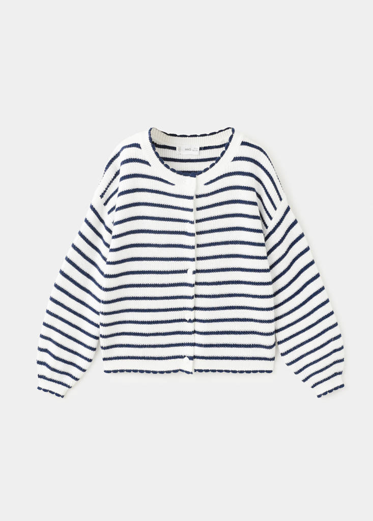 Cotton fabric. Fine knit fabric. Striped fabric. Round neck with waves. Long sleeves. Button fastening at the front