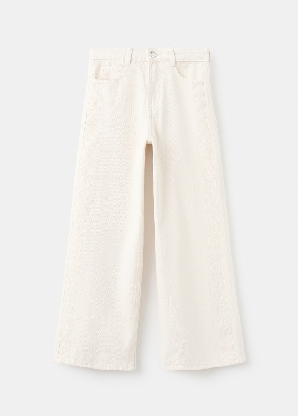 100% cotton fabric. Wide-leg design. Embroidered side detail. Belt loops. Button and zip fastening. Five pockets.