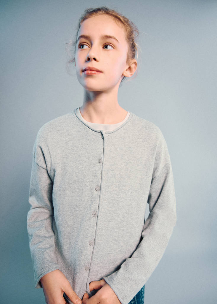 Standard Length. Long Sleeve Length. Straight Silhouette. Round Lapel Collar. Fine Knit Structure. Front Closure Location. 100% cotton fabric. Straight design. Round neck. Long sleeves. Front closure with buttons