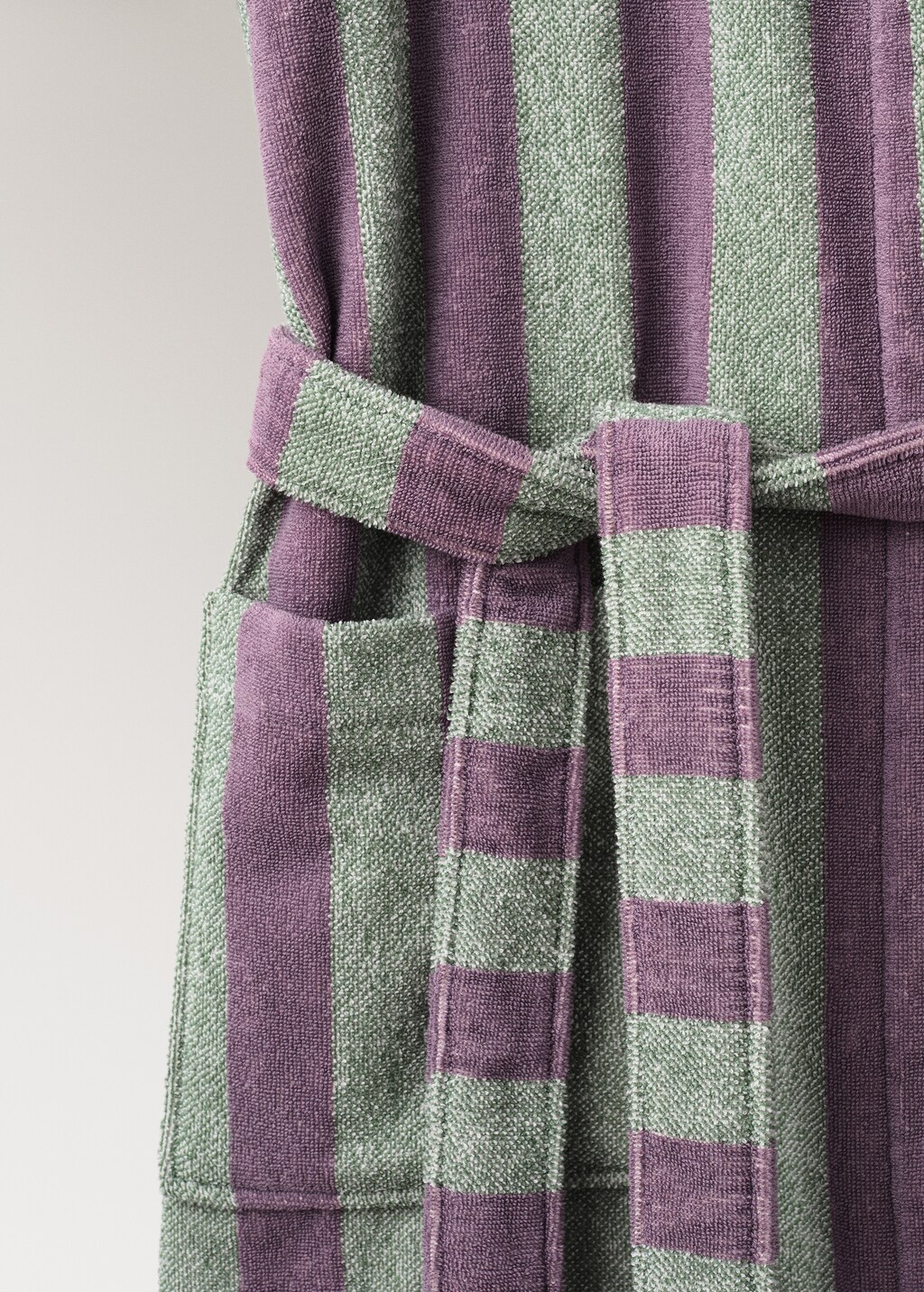 Thick cotton fabric. Weight: 480 g/m2. Adjustable strap. Stripe design. With hood. Its modern design enhances any bathroom, combining softness and excellent absorption. Available in two colours. Coordinates with more products from the collection.