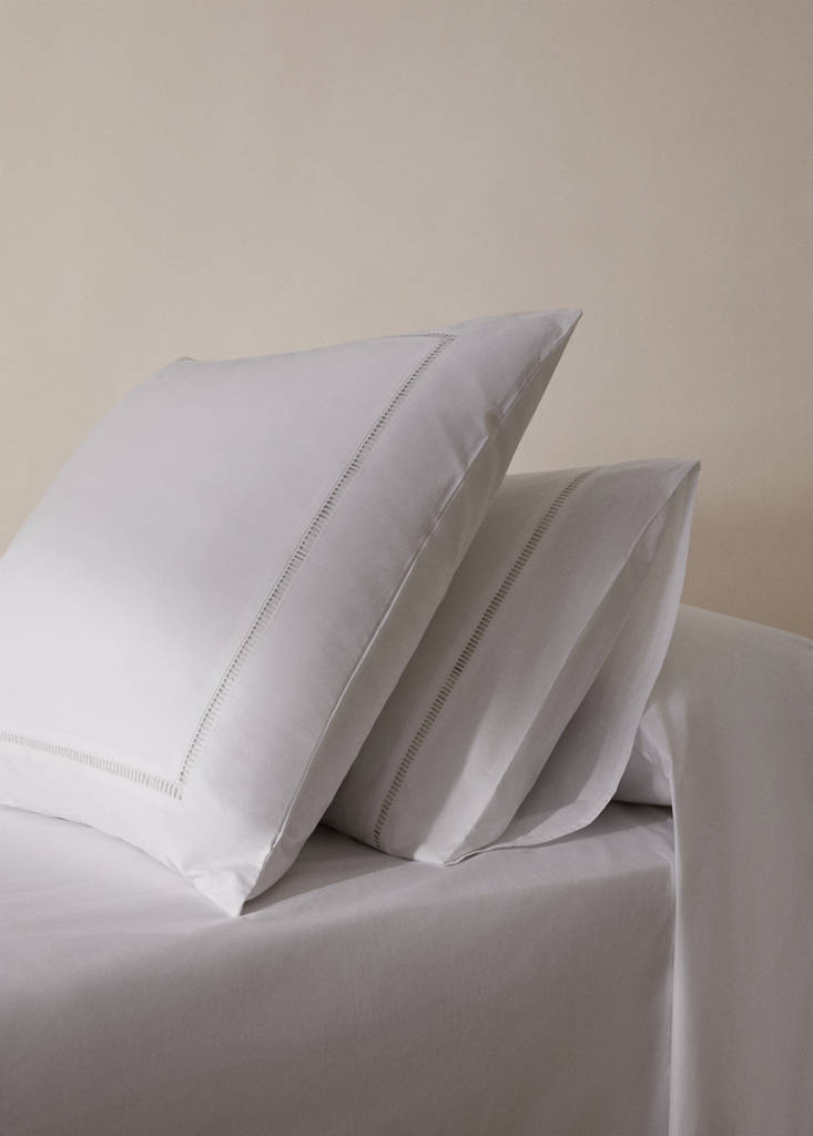 Pack of 2. Size: 60x60cm. 100% cotton fabric. 200 cotton threads offer maximum softness, resistance and breathability, providing a lightweight soft touch feeling. Percale cotton fabric, highly breathable, soft and supple. Hemstitch detail. Filling not included. 100% Cotton. Breathable fabric. Creates a warm and pleasant atmosphere. Sold by unit. Plain fabric with embroidery details