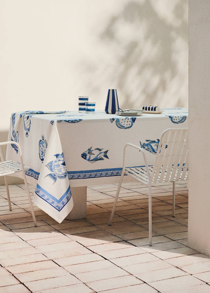 Cotton and linen fabric. Size: 150x250 cm. Tablecloth for 6 to 8 diners made from a linen and cotton blend, providing a natural texture, high stain absorption, and resistance after each wash. Decorative marine motif design. Matches with its coordinating napkins. Available in more sizes