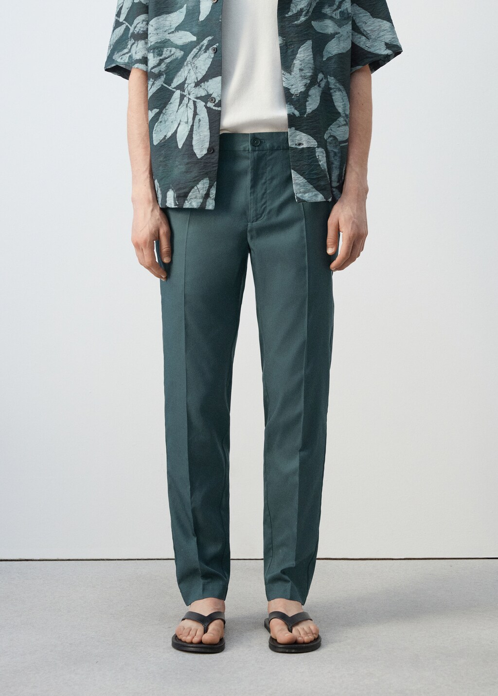 Regular fit. Lyocell fabric. Belt loops. Zip and button fastening. Two side pockets. Elasticated waist