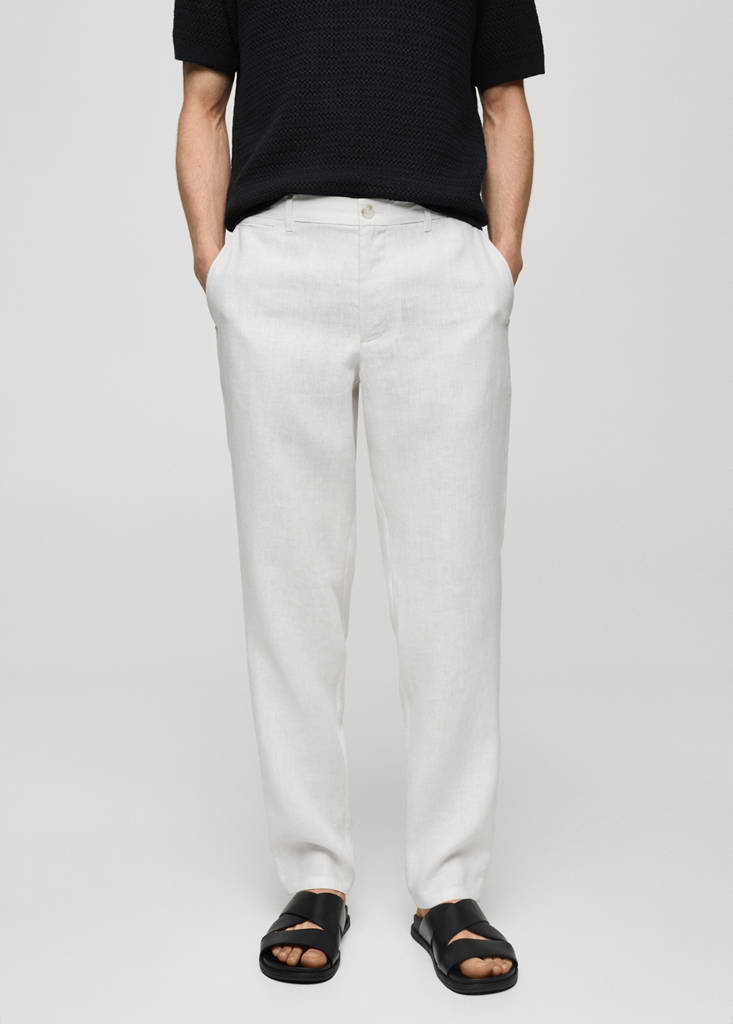 Slim fit. 100% linen fabric. Mid-rise. Belt loops. Front fastening with double-breasted buttons and zip. Two front pockets. Coin pocket at hip height. Two welt pockets with button at the back. The beige colour is an online exclusive. Two-coin pockets. Standard design