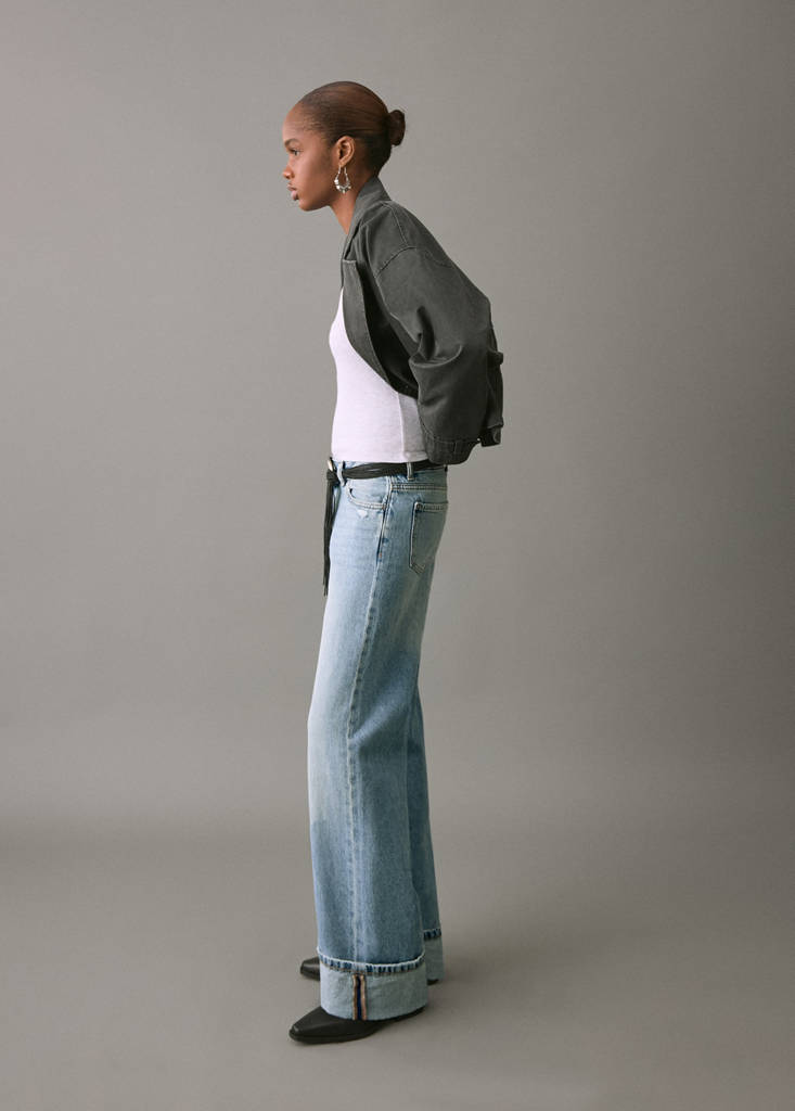 Cotton fabric. Long design. Wide-leg design. Regular Waist. Button and zip fastening. Belt loops. Two side pockets. Two side patch pockets. Turned-up hem