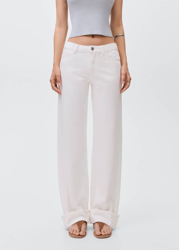100% cotton fabric. Long design. Wide-leg design. Belt loops. Button and zip fastening. Two side pockets. Coin pocket. Two patch pockets at the back. Cuffed hem