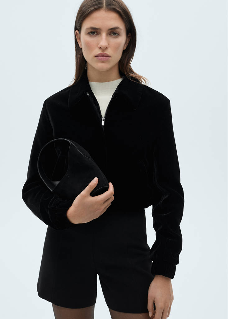 Velvet fabric. Bomber design. Straight design. Shirt collar. Long sleeves with buttoned cuffs. Two side pockets. Zip fastening on the front section. Hem with elastic band. Party, ceremony and communion collection