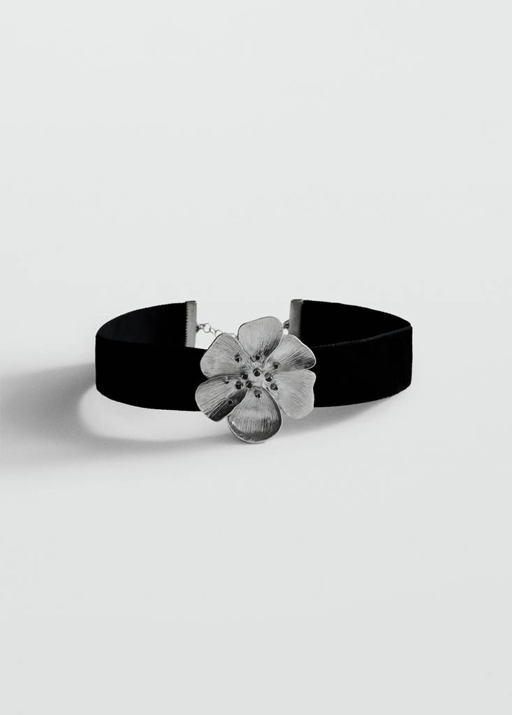 Choker style. Faceted crystal detail. Zip and carabiner fastening. Adjustable closure. Flower detail. Party, ceremony and communion collection