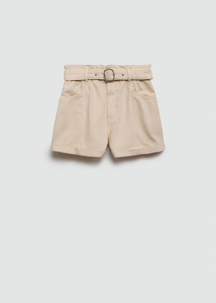 Denim-style cotton fabric. Short design. Straight design. High waist. Paperbag. Two front pockets. Two patch pockets at the back. Belt loops. Belt buckle fastening. Front zip and button closure