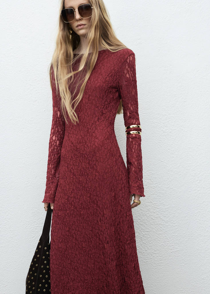 Csipke anyag. Hosszú dizájn. Karcsúsított dizájn. Kerek nyakkivágás. Hosszú harang ujj. Zár nélkül. Belső bélés. Ez a ruhadarab a casual kollekciónk része, amelyet úgy terveztünk, hogy stílusosan kísérjen el a mindennapjaid során