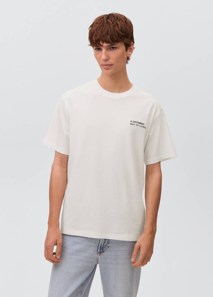 Ez a póló 100% pamut anyagból készült, egyenes szabású és mintás. Kerek nyakkivágással és rövid ujjakkal rendelkezik. A nyomtatott szöveg díszíti mind az elülső, mind a hátsó részt