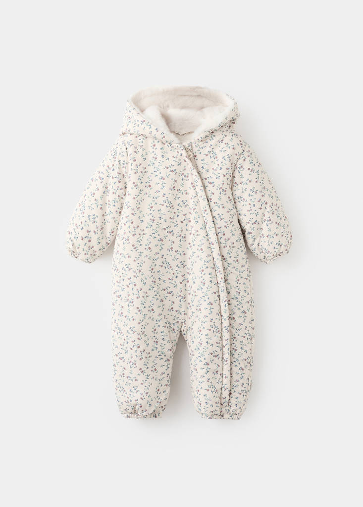 Steppelt anyag. Virágos dizájn. Szintetikus szőrméjű kapucni. Polár belső bélés. Elülső cipzár
