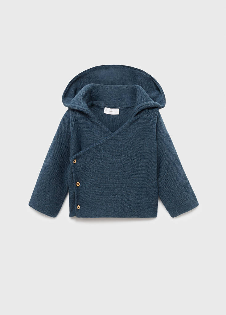Kötött anyag. Pamut anyag. Keresztezett dizájn. Elülső gombos záródás. Kapucnival. Karácsonyi kollekció