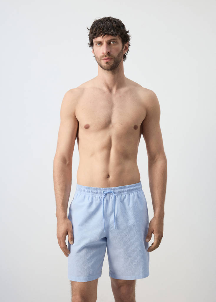 Boxer type. Cotton blend fabric. Seersucker effect. Elastic waist with adjustable drawstring. Two side pockets. Back patch pocket with Velcro. Small side slits on the hem