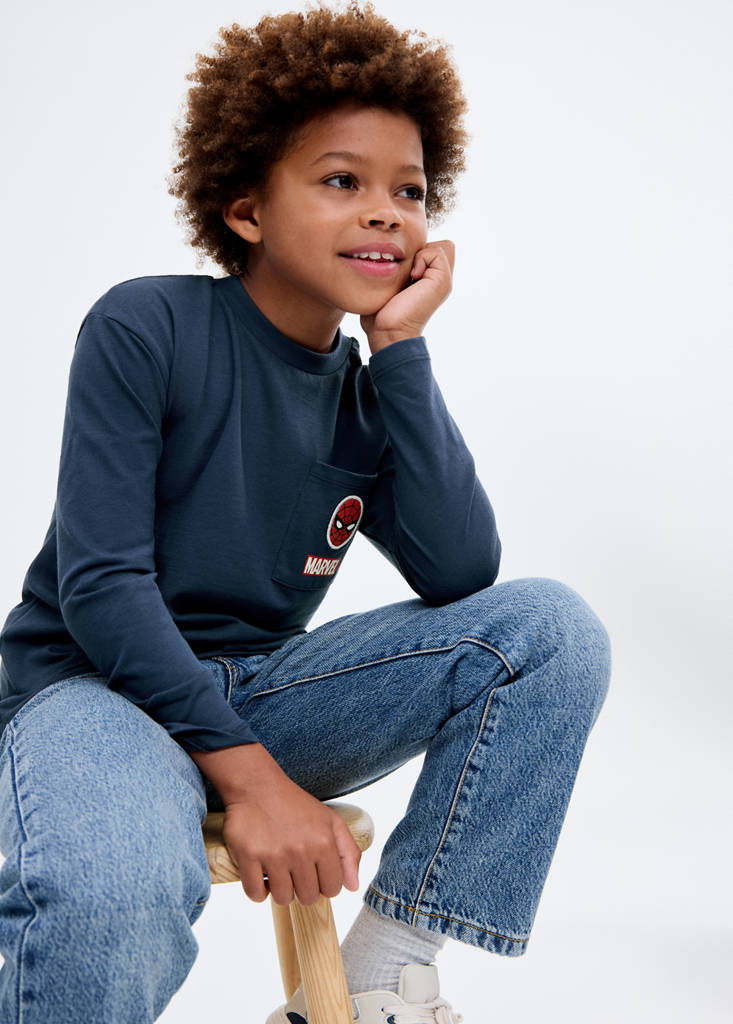 Kain 100% katun. Desain panjang. Desain lurus. Kerung leher bulat. Lengan panjang. Pola Spiderman. Gambar bordiran. Lisensi