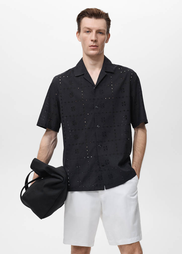 Siluet Reguler. 100% Katun. Kerah bowling. Lengan pendek. Detail bordir berlubang. Bawah lurus. Bukaan kecil di bagian bawah samping