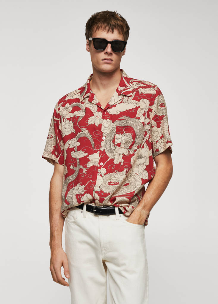 Regular fit. Kain mengalir. Kerah bowling. Saku tempel di dada. Lengan pendek. Bawah lurus. Desain bermotif