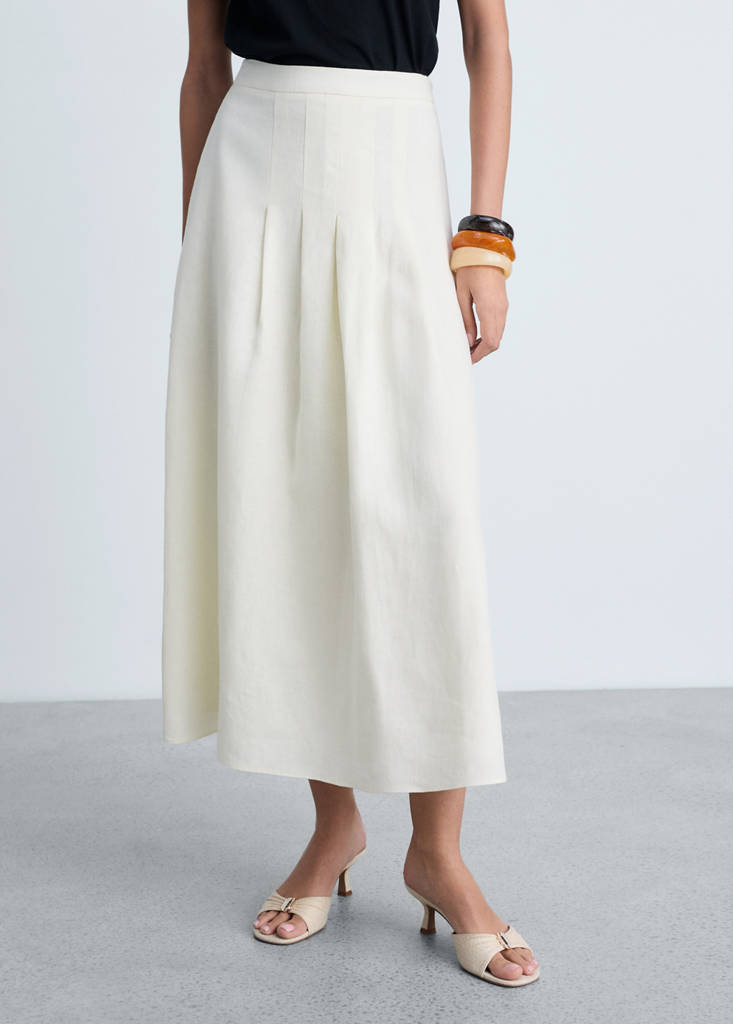 Kain 100% linen. Desain A-line. Desain panjang. Pinggang tinggi. Detail lipit. Ritsleting samping. Lapisan dalam