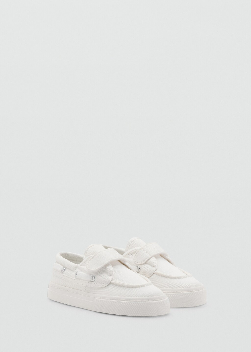 100% Cotton. Rounded instep. Contrast rubber sole. Backstitched details. Velcro fastening.