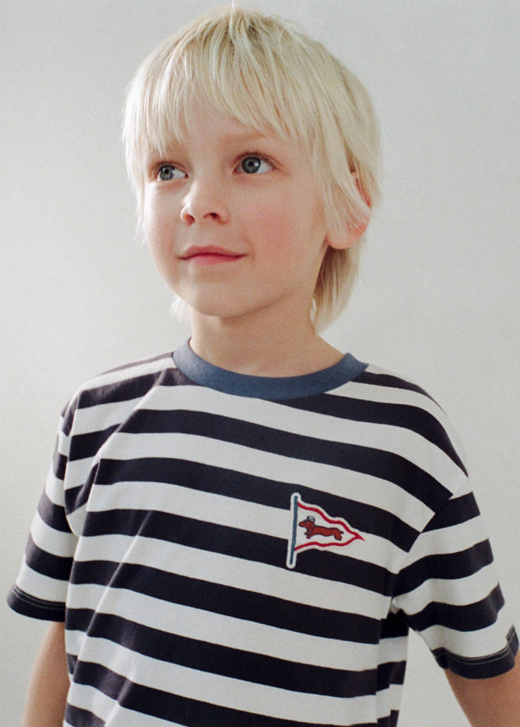 100% cotton fabric. Striped fabric. Straight design. Contrast crew neck. Short sleeves. Embroidered detail on the chest. Printed design on the back. Valentine Collection