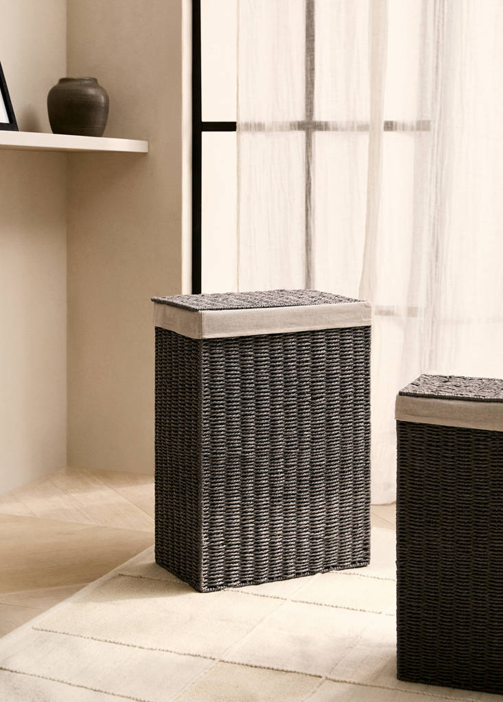 Large paper laundry basketCurrent price [€ 49.99 ]€ 49.99Select a colourGreySelect your sizeMLSizeChoose your sizeAddAdd to your wishlistSee lookFree delivery to store100% paper. Size: 45x27x64cm. With integrated handle. Inner lining. Ideal for laundry or storage while maintaining an elegant aesthetic. Available in two sizes. Available in two coloursDetails, composition and careStore availability