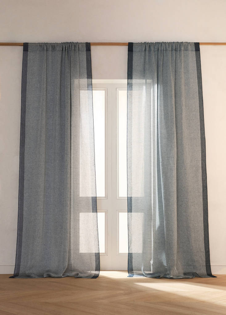 100% Linen. Size: 140x270cm. Low opacity. A distinctive feature is the side stripe, which frames the curtain and creates a subtle and sophisticated contrast. Sold by unit. Rod curtain. Available in two colours