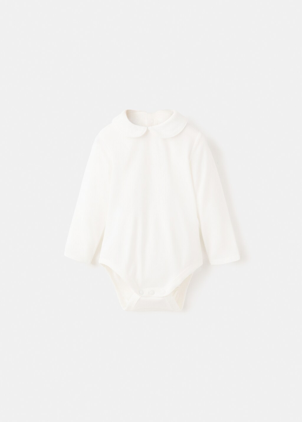 Cotton blend fabric. Body design. Round neck. Peter Pan collar. Long sleeve. Press-stud fastening. Hidden button closure at back.