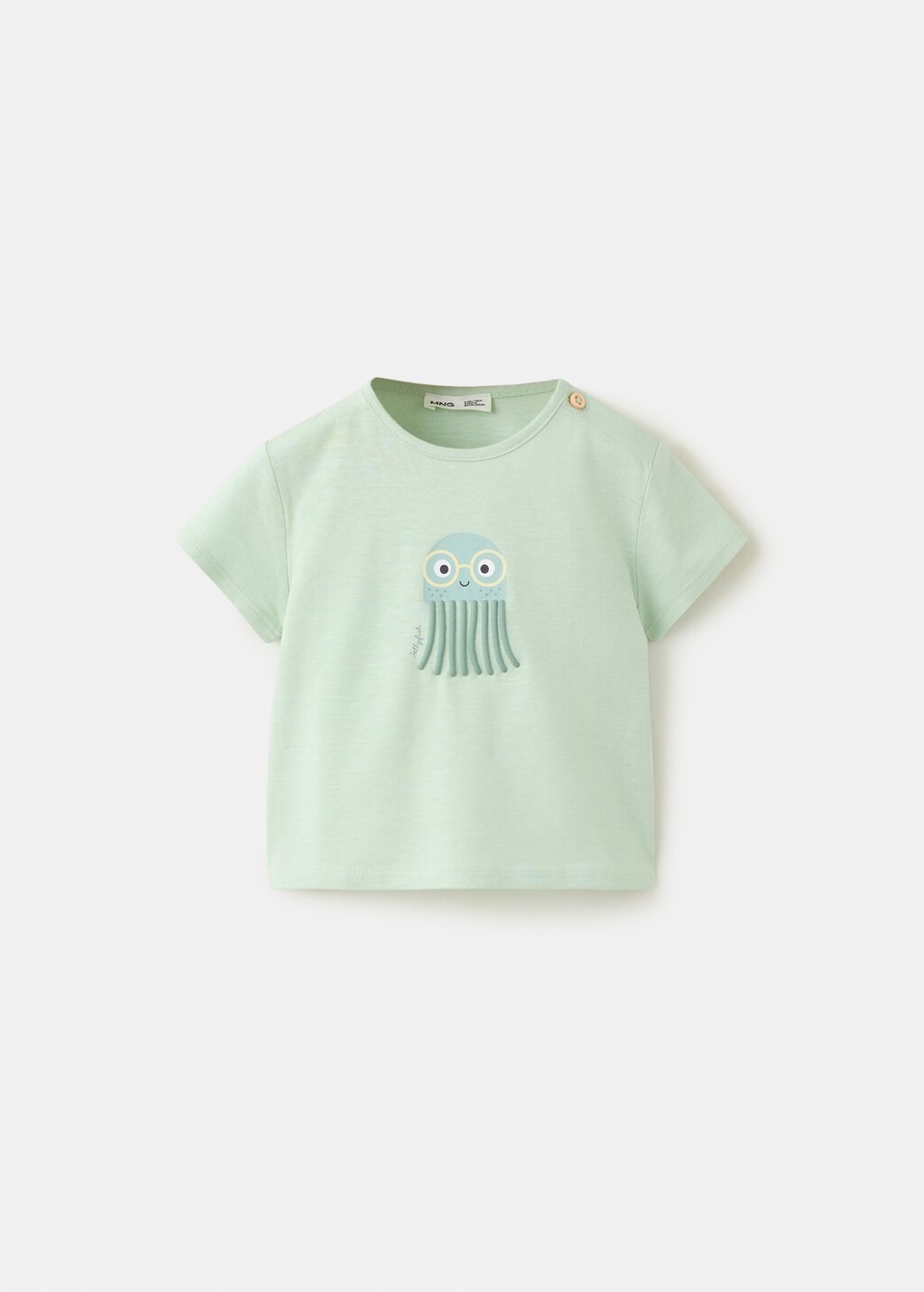 100% cotton fabric. Straight design. Round neck. Short sleeves. Printed animal. Drawing of a jellyfish. Button fastening on the shoulder