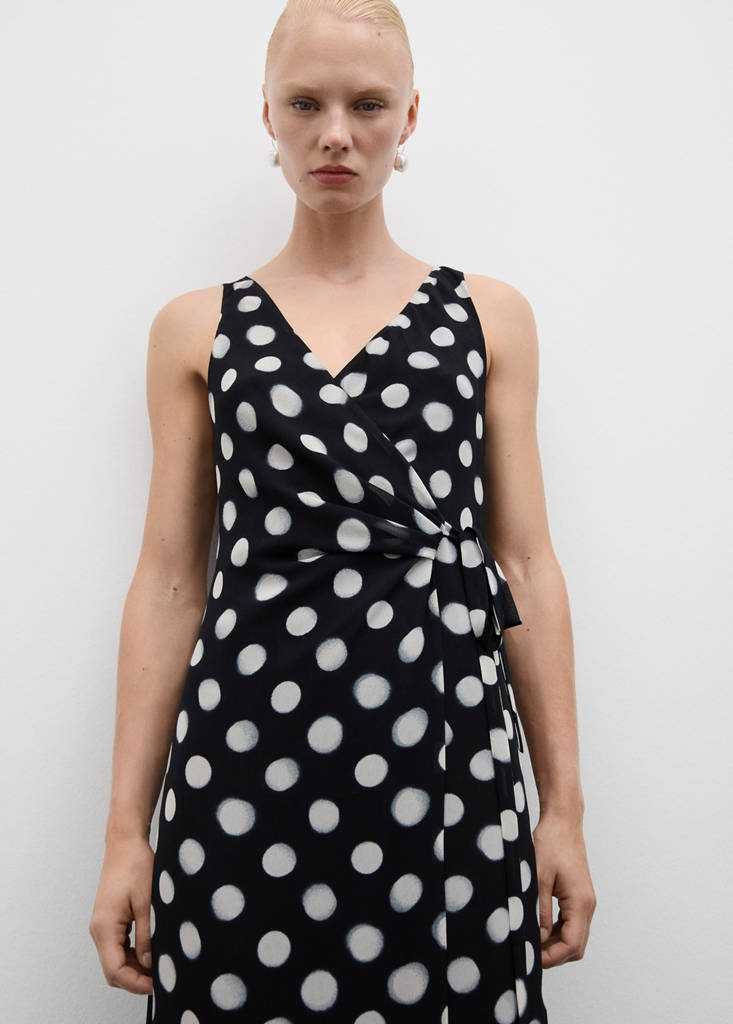 Fluid fabric. Long design. Straight design. Wrap design. Spots print. V-neckline. Sleeveless. Wide straps. Side bow fastening. Inner lining. Party, ceremony and communion collection