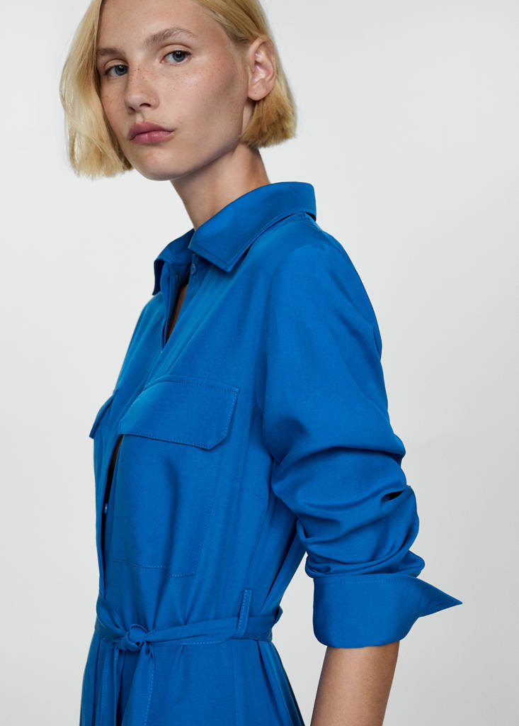 Linen and lyocell blend fabric. Midi design. Straight design. Shirt collar. Long sleeves with buttoned cuffs. Two patch pockets at the front. Belt loops. Adjustable tie. Hem with side slits. Front closure with buttons