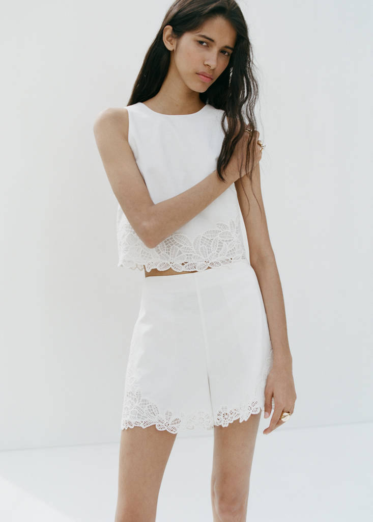 Cotton and linen fabric. Straight design. Short design. Regular Waist. Two side pockets. Cut-out embroidered details. Total look