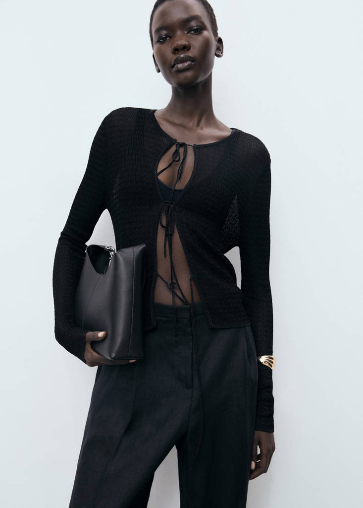 Semi-transparent design. Medium knit fabric. Straight design. Crew neck. Long sleeves. Bow closure on the front