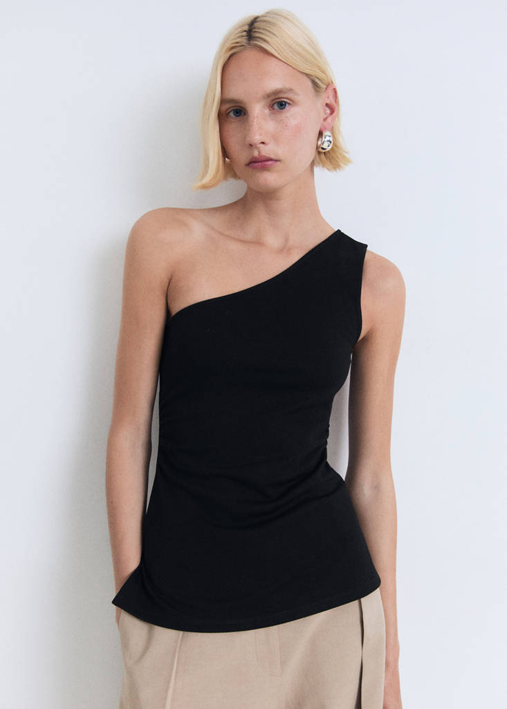 Featuring a fitted design, this top boasts an asymmetrical neckline and a wide strap. The draped waist adds a distinctive touch, while the absence of a fastening ensures comfort and simplicity. Sleeveless