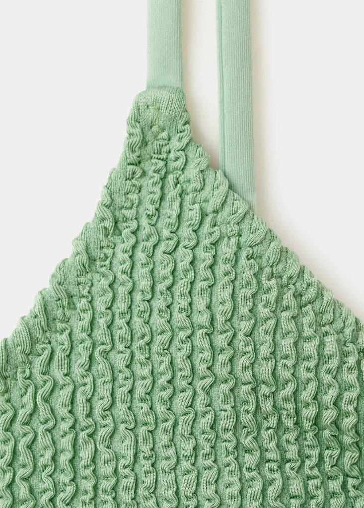 Online ExclusiveTriangular texture bikini topCurrent price [ ש"ח 139.90 ] ש"ח 139.90Select a colourPastel GreenSelect your sizeXSSMLXLDimensionsAdd to WishlistSee lookFree delivery to storeTextured fabric. Triangular design. V-neck. Elastic straps. Hook fastening. Inner lining. Detachable filling. Online ExclusiveDetails, composition and careStore availability